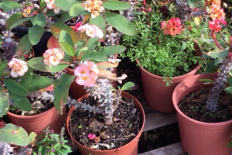Les euphorbes, Euphorbia sp., se présentent également sous des formes remarquables. Certaines ressemblent à des cactées, d’autres à des succulentes sans feuille, certaines sont de petits arbustes et d’autres de petits arbres. Elles poussent dans des recoins secs et arides. Puis, il y a les joubarbes, Aeonium sp., toutes endémiques des îles Canaries. Enfin et surtout, nous trouvons les lotus. Lotus berthelotii est un classique des Canaries avec ses fleurs rouge vif en forme de griffe et un feuillage grisé. Aujourd’hui, on l’’utilise en panier suspendu. Il a probablement disparu à l’état sauvage.