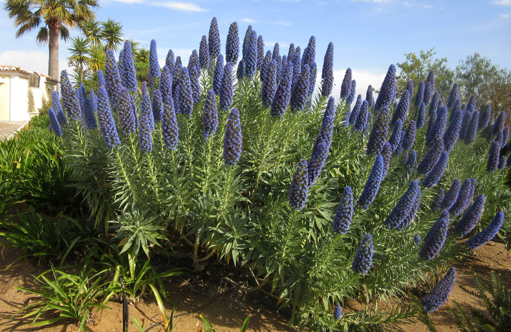 Some plants with magnificent blue flowers are impossible for us to grow because they need cool summers or frost-free winters. However, there is a wide choice of blue-flowered plants suitable for the Occitan garden and Pierre highlighted a number which have done well for him. These included several varieties of iris, salvia and agapanthus, but also rarely grown Leucophyllum langmaniae, globularia, Iochroma australe and Phacelia campanularia (Virginia bellflower).