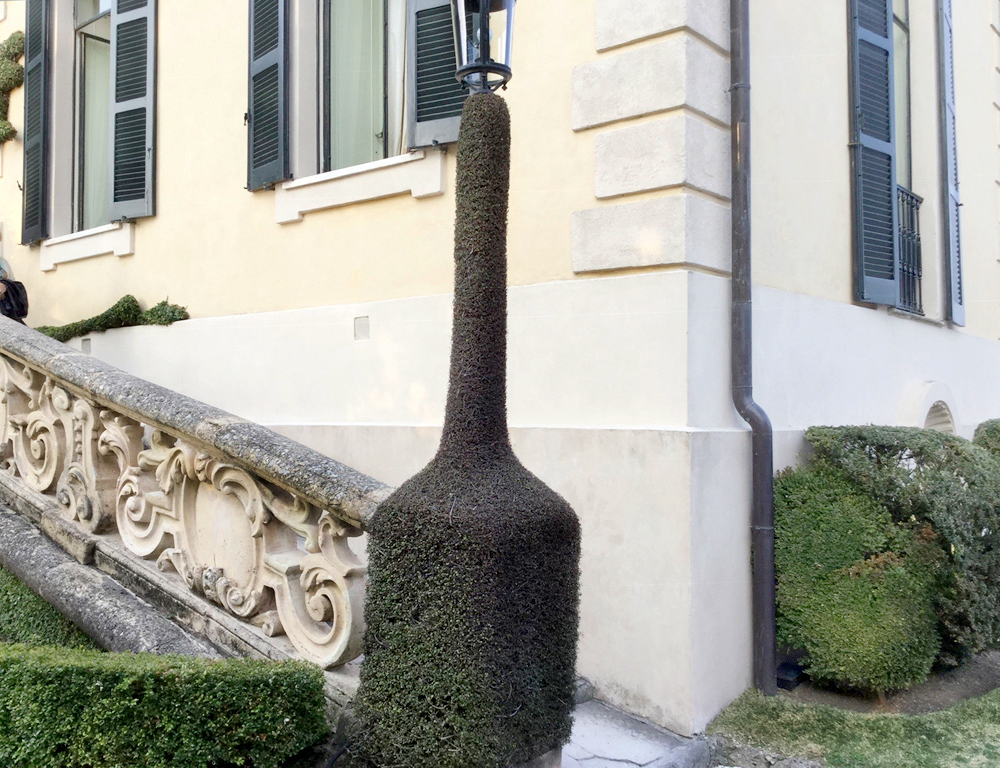 Le topiaire le plus étrange, vraiment pas à sa place, est une cheminée de Muehlenbeckia axillaris taillé, grimpante persistante à petites feuilles originaire de Nouvelle-Zélande.